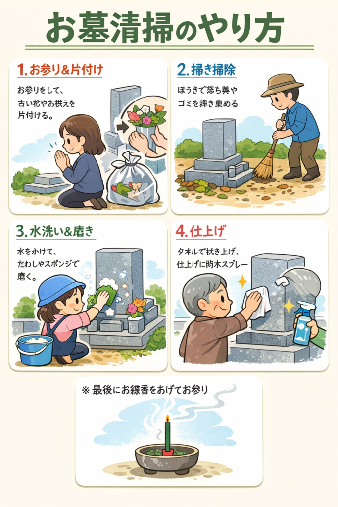 お墓のクリーニングは、以下の手順で行うのが一般的です。